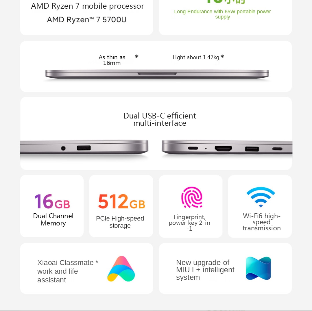 Pre-installed Windows 10 Home Edition, Genuine Office Home and Student Edition, DTS Audio Processing, Xiaomi Cloud Service, Xiaomi Pictorial, Service Center, Mi Service. OSD Utility. MIUI+ (cross-screen collaboration, Xiaomi mutual transmission), Fn+K performance Smart selection mode (quiet mode/balanced mode/speed mode)