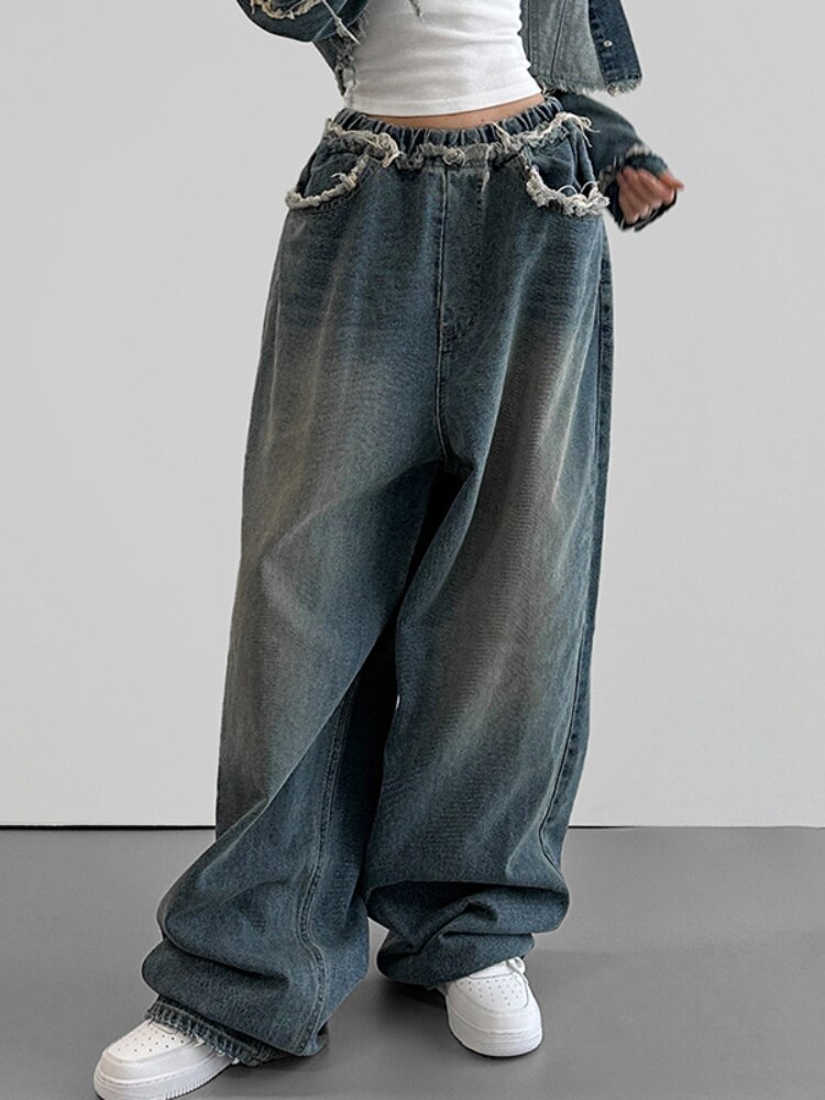 WeiYao Raw Edge Baggy Pants High Waisted Washed Wide Leg Jeans Vintage 90s Korean Fashion Streetwear y2k Women's Jeans Joggers