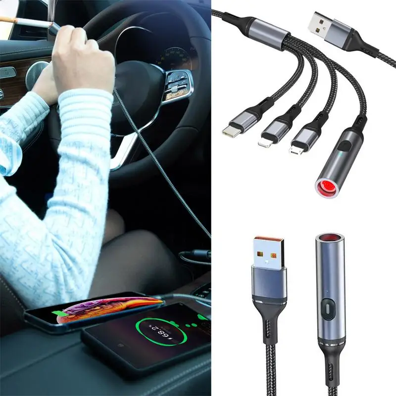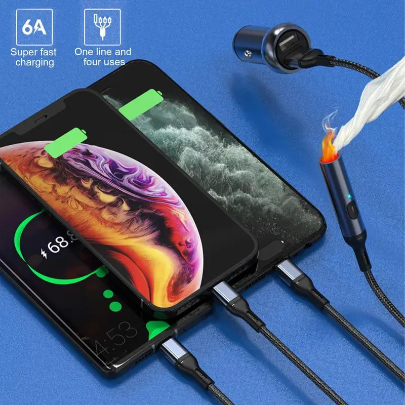 Universal 4 In 1 Multiple USB Cable Nylon Braided Fast Charging Cord Adapter with Cigars Lighter Type-C Micro Port Connectors