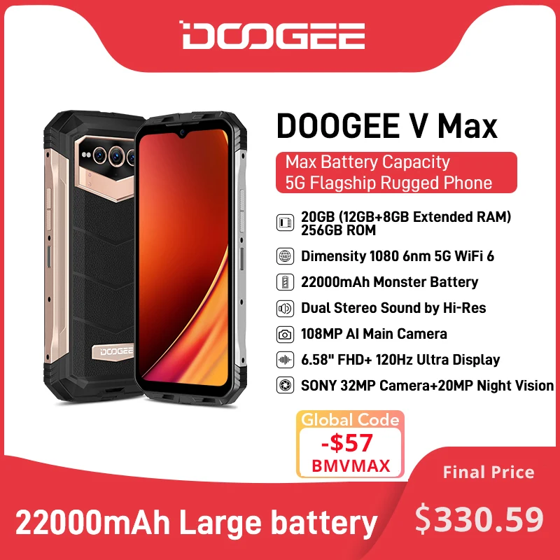 World Premiere DOOGEE V Max 5G Rugged Phone 22000mAh Battery 12GB(+8GB Extend )+ 256GB Cellphone 108MP AI Main Camera Smartphone 120Hz Dimensity 1080 Hi-Res Cell Phone
