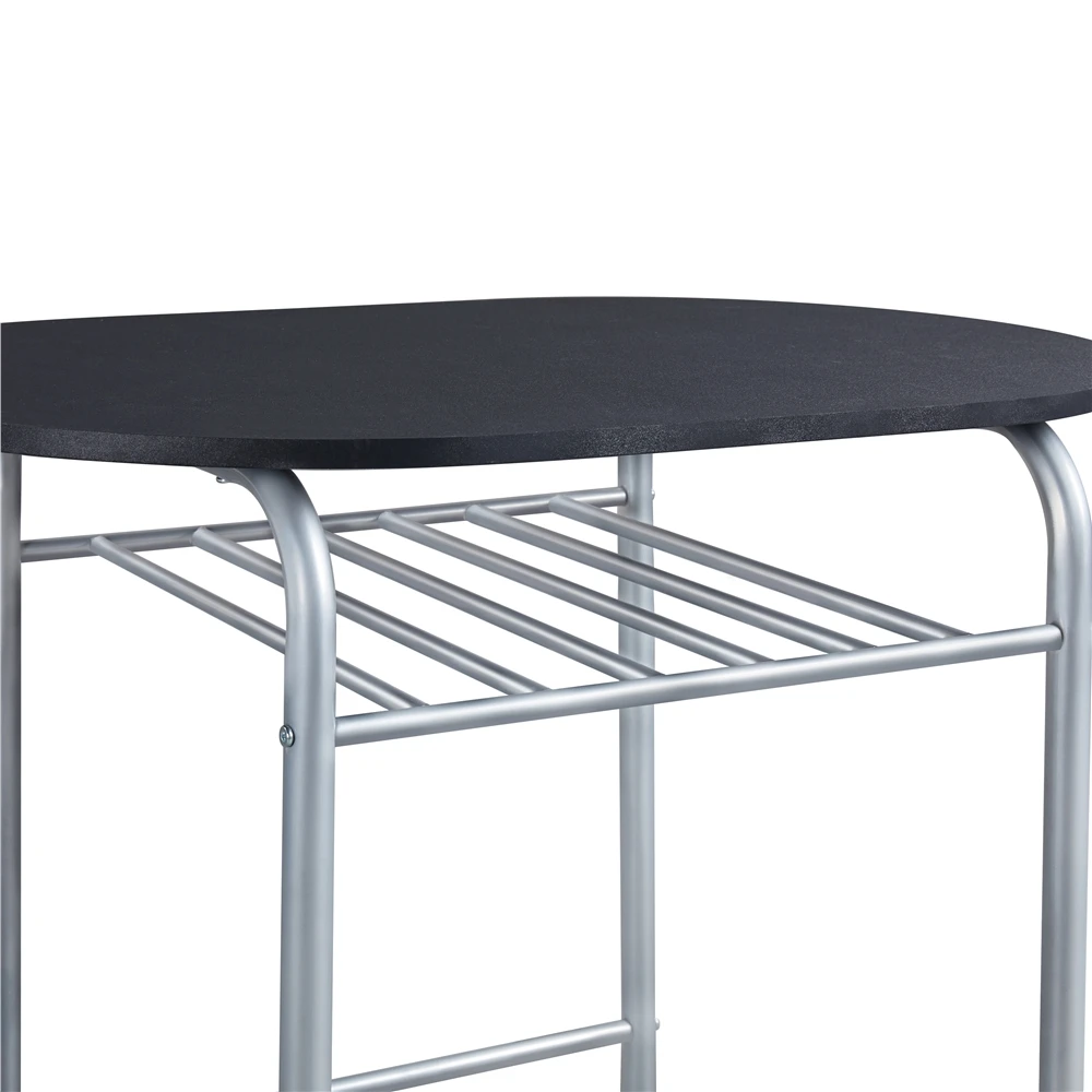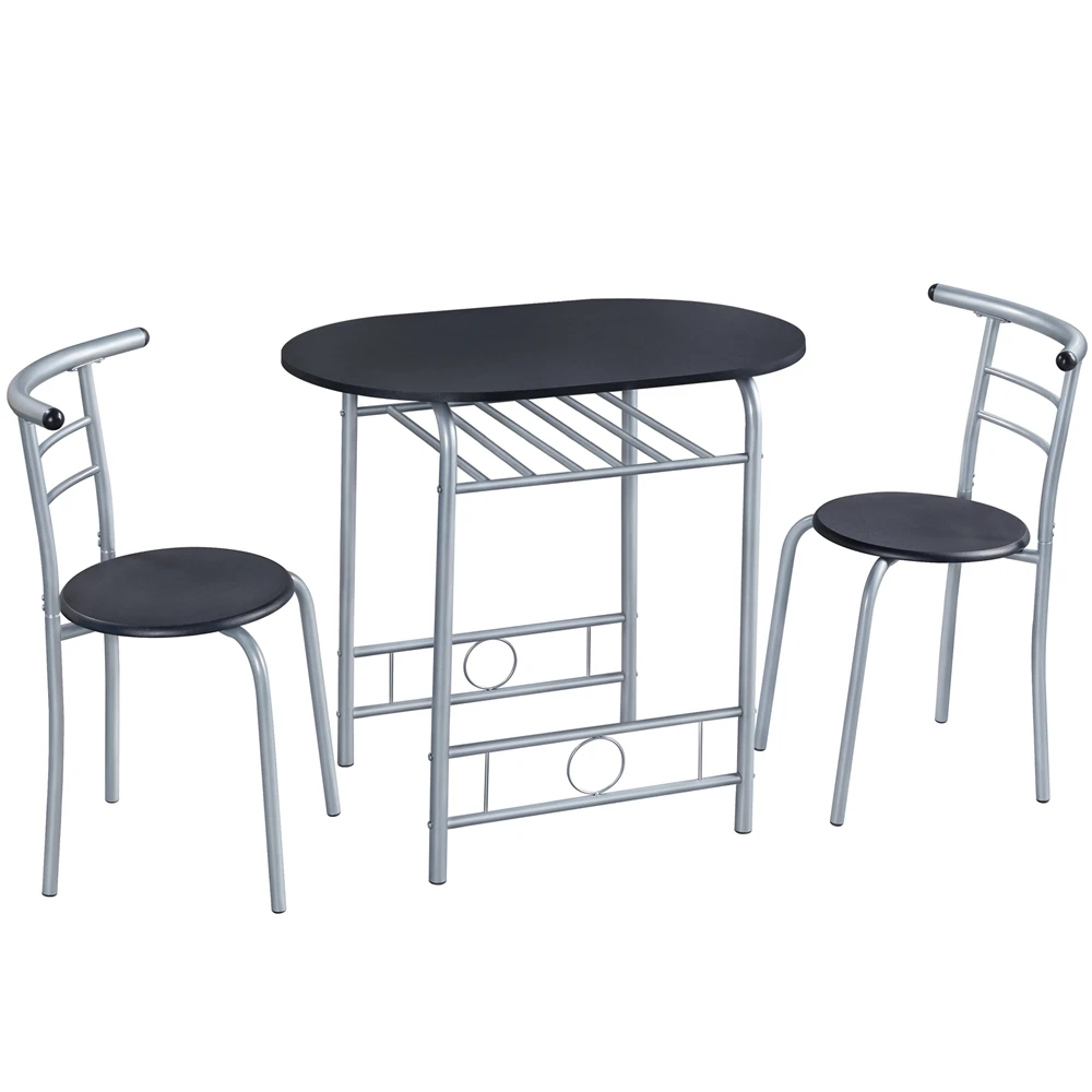 This 3-piece wooden dining table set includes 2 chairs with a mid-height backrest and round wooden seat, which are comfortable to sit in during the break.Create a cozy dining area with this practical dining table set. This set is made of premium MDF boards and a metal tube structure, which is sturdy enough for years of use. Featuring a waterproof tabletop and powder-coated steel legs, the daily maintenance will be super easy. With 2 chairs, you can enjoy coffee or breakfast alone, or with your lover or friends pleasantly. When the chairs are pushed in, this dining set only takes up very little room, which is perfect for small spaces. Showcasing curved lines and round edges, this set gives you a relaxed and inviting feeling. The lightweight design makes this set easy to move around for your changing needs. It could perfectly fit into a small kitchen, dorm room, apartment or a corner of your house to create a cozy dining area or relaxing place.